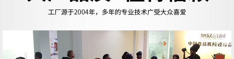 廣州旭眾食品機械有限公司是一家集科研開發(fā),生產(chǎn)設(shè)計,營銷服務(wù)為一體的現(xiàn)代化生產(chǎn)企業(yè)。現(xiàn)代化生產(chǎn)車間,精湛制造技術(shù),所產(chǎn)機械歷經(jīng)市場重重考驗,不斷贏得海內(nèi)外客戶的贊譽。