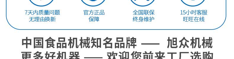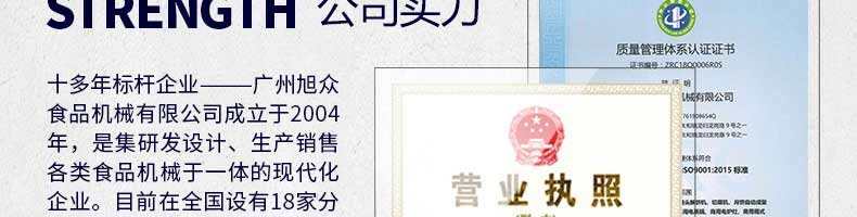 廣州旭眾食品機械有限公司是一家集科研開發(fā),生產設計,營銷服務為一體的現代化生產企業(yè)。現代化生產車間,精湛制造技術,所產機械歷經市場重重考驗,不斷贏得海內外客戶的贊譽。