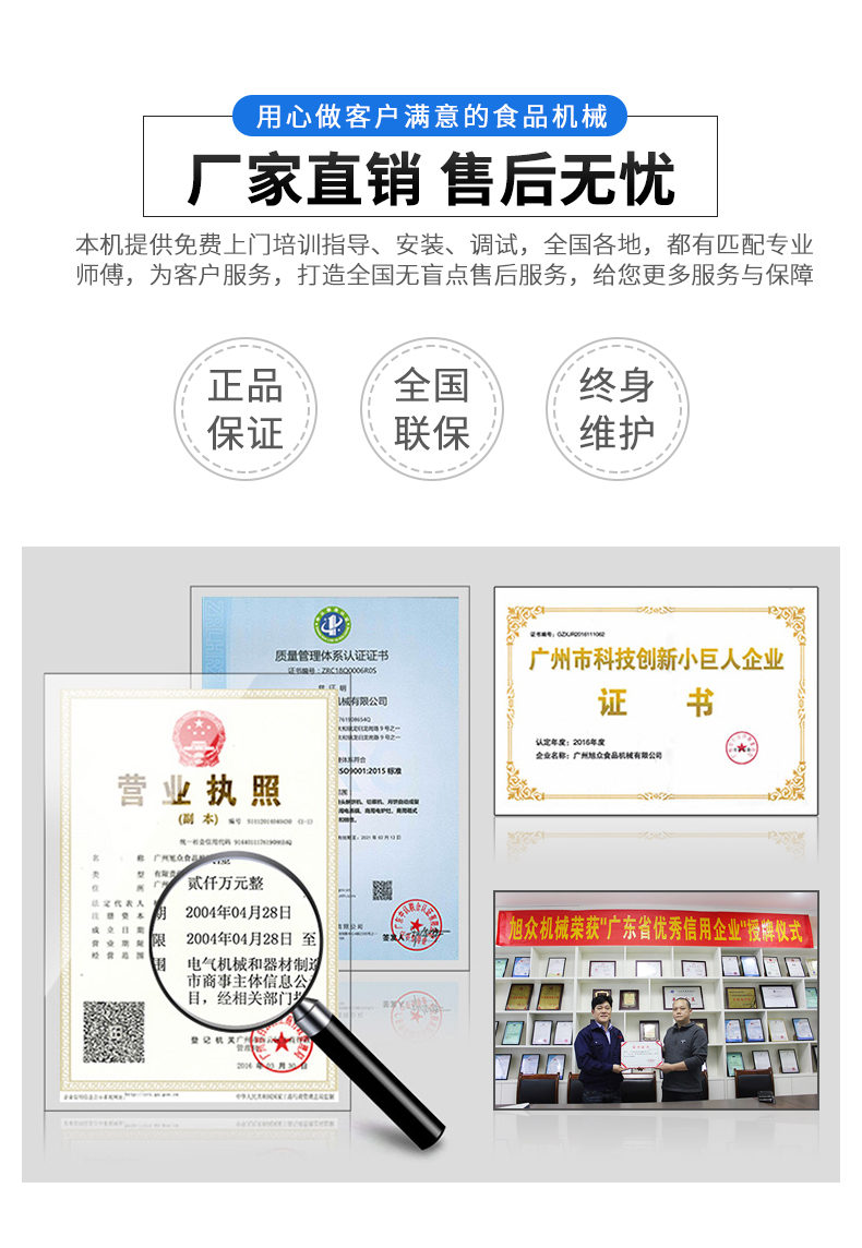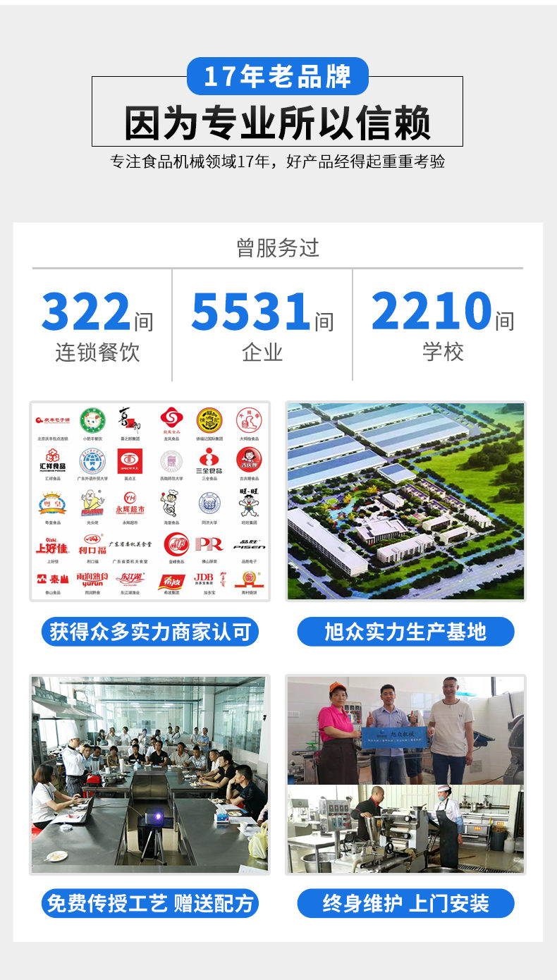 廣州旭眾食品機械有限公司是一家集科研開發,生產設計,營銷服務為一體的現代化生產企業。現代化生產車間,精湛制造技術,所產機械歷經市場重重考驗,不斷贏得海內外客戶的贊譽。
