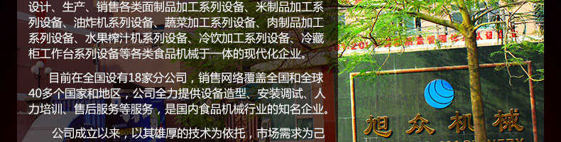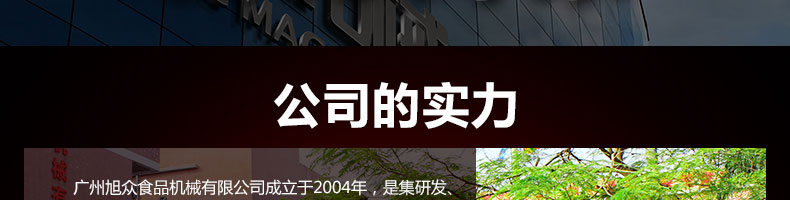 廣州旭眾食品機械有限公司是一家集科研開發(fā),生產(chǎn)設(shè)計,營銷服務(wù)為一體的現(xiàn)代化生產(chǎn)企業(yè)。現(xiàn)代化生產(chǎn)車間,精湛制造技術(shù),所產(chǎn)機械歷經(jīng)市場重重考驗,不斷贏得海內(nèi)外客戶的贊譽。