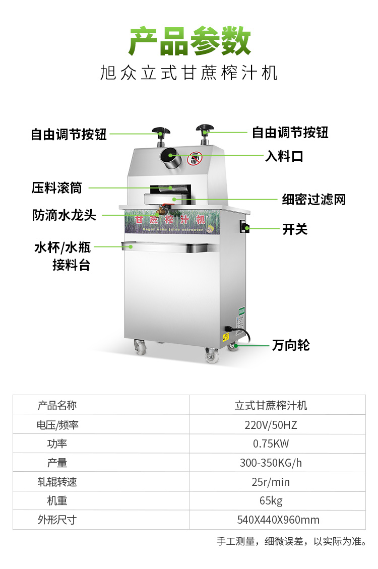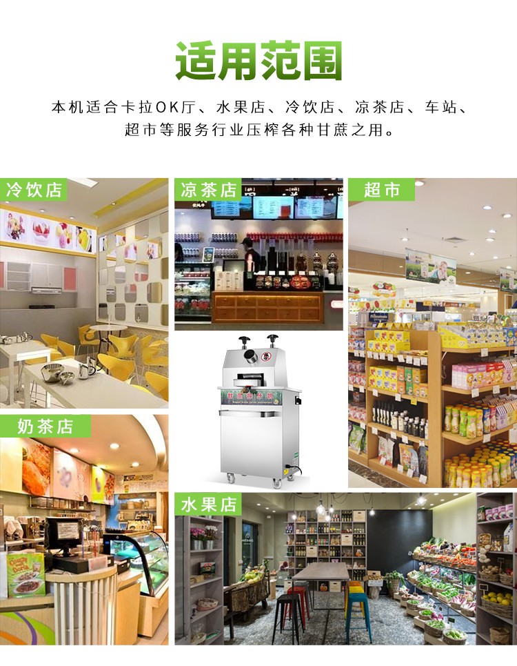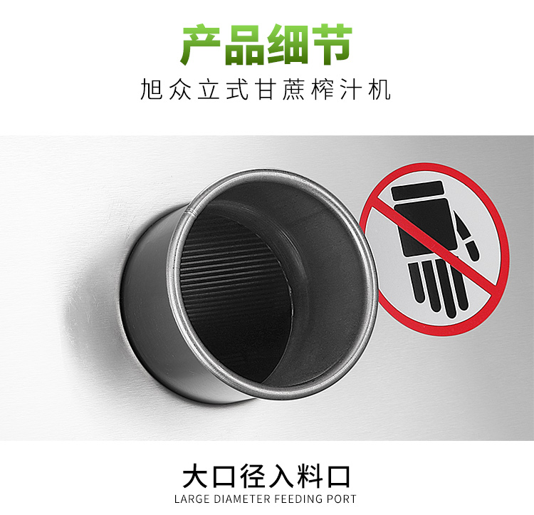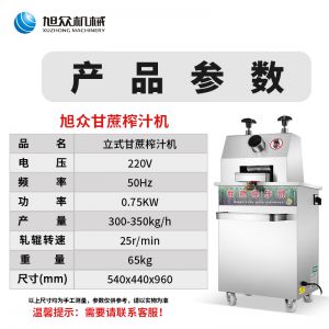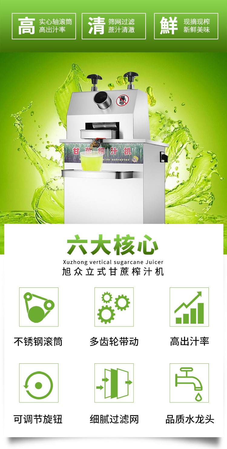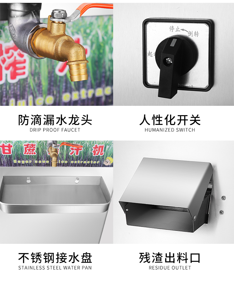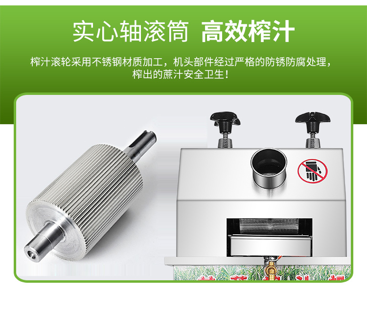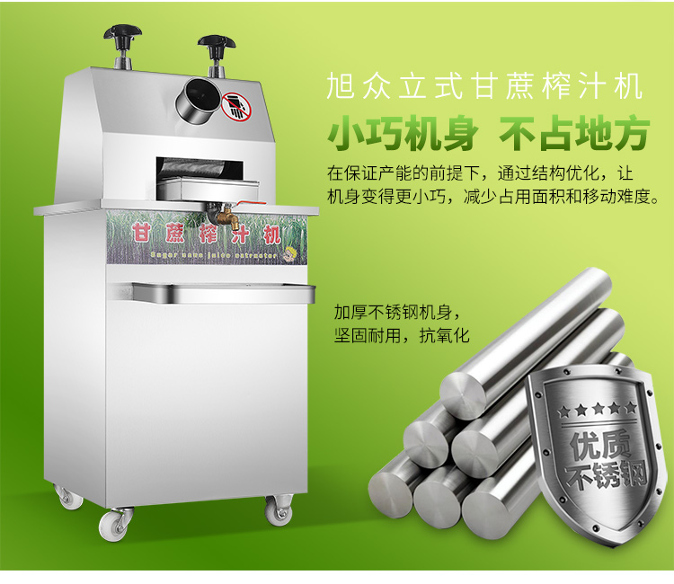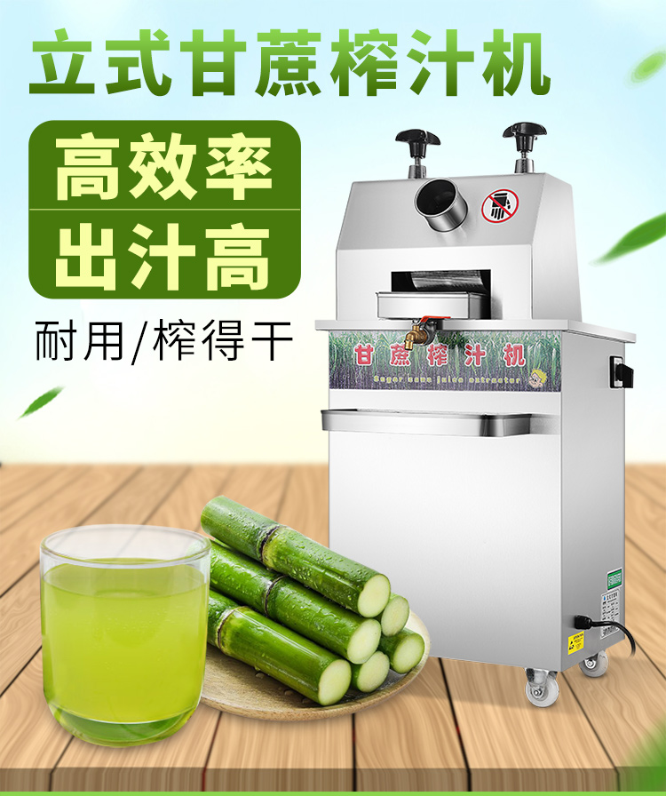 立式甘蔗機(jī),該機(jī)采用不銹鋼材質(zhì)加工,機(jī)頭部件都經(jīng)過(guò)嚴(yán)格的防銹仿腐蝕處理,整機(jī)采用全封閉結(jié)構(gòu),可內(nèi)置蔗渣桶,保證渣汁不外泄,安全、干凈、衛(wèi)生。 適合賓館、卡拉OK廳、水果店、冷飲店、涼茶店、車(chē)站、超市等服務(wù)行業(yè)壓榨各種甘蔗之用。