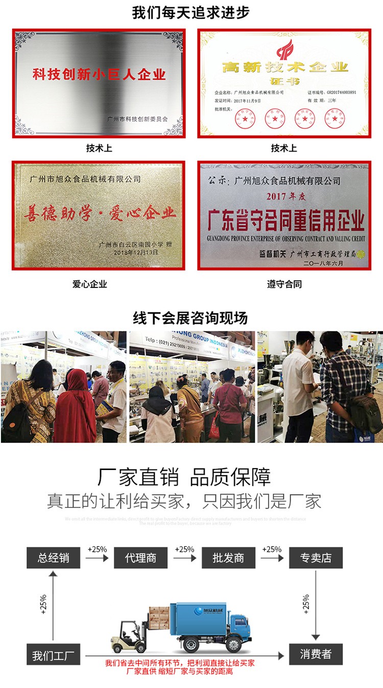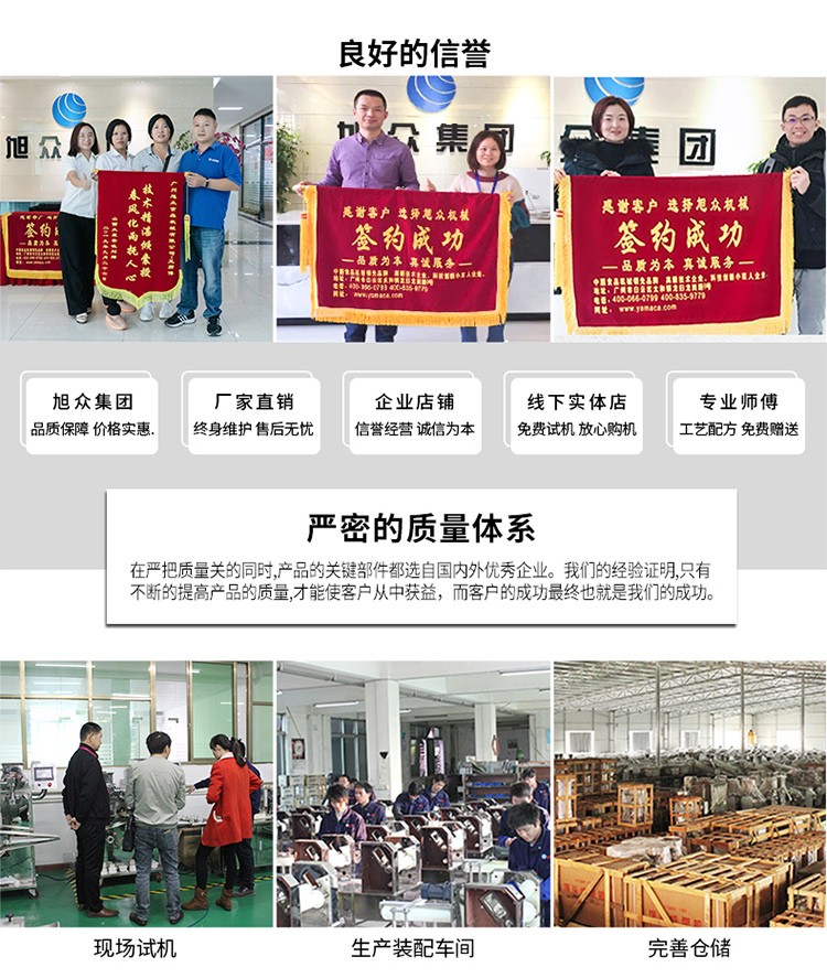 廣州旭眾食品機(jī)械有限公司是一家集科研開(kāi)發(fā),生產(chǎn)設(shè)計(jì),營(yíng)銷(xiāo)服務(wù)為一體的現(xiàn)代化生產(chǎn)企業(yè)。現(xiàn)代化生產(chǎn)車(chē)間,精湛制造技術(shù),所產(chǎn)機(jī)械歷經(jīng)市場(chǎng)重重考驗(yàn),不斷贏得海內(nèi)外客戶(hù)的贊譽(yù)。