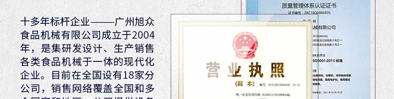 廣州旭眾食品機械有限公司是一家集科研開發,生產設計,營銷服務為一體的現代化生產企業。現代化生產車間,精湛制造技術,所產機械歷經市場重重考驗,不斷贏得海內外客戶的贊譽。