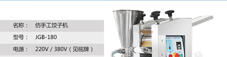 JGB-180餃子機,先進的自動餃子生產設備,包括主動壓皮部分、自動供餡部分、自動包合部分、自動成品輸送部分,并且只要更換模具,就可制鍋貼等食品。適合食品速凍廠、飯店、廠礦學校食堂等制作包餡面制品單位使用。