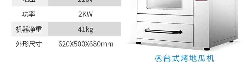 名稱立式烤地瓜機 電源220V 功率3.2KW,2kw 產量 尺寸783*470*1280mm,620*500*680mm 重量70kg,41kg 規格 其他
