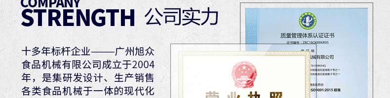 廣州旭眾食品機械有限公司是一家集科研開發(fā),生產(chǎn)設計,營銷服務為一體的現(xiàn)代化生產(chǎn)企業(yè)。現(xiàn)代化生產(chǎn)車間,精湛制造技術,所產(chǎn)機械歷經(jīng)市場重重考驗,不斷贏得海內(nèi)外客戶的贊譽。