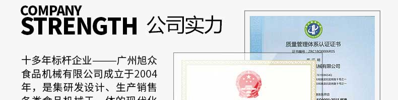 廣州旭眾食品機械有限公司是一家集科研開發,生產設計,營銷服務為一體的現代化生產企業。現代化生產車間,精湛制造技術,所產機械歷經市場重重考驗,不斷贏得海內外客戶的贊譽。