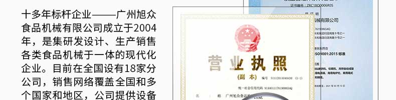 廣州旭眾食品機(jī)械有限公司是一家集科研開(kāi)發(fā),生產(chǎn)設(shè)計(jì),營(yíng)銷服務(wù)為一體的現(xiàn)代化生產(chǎn)企業(yè)。現(xiàn)代化生產(chǎn)車間,精湛制造技術(shù),所產(chǎn)機(jī)械歷經(jīng)市場(chǎng)重重考驗(yàn),不斷贏得海內(nèi)外客戶的贊譽(yù)。