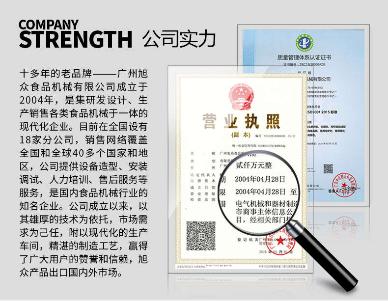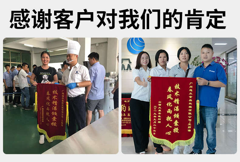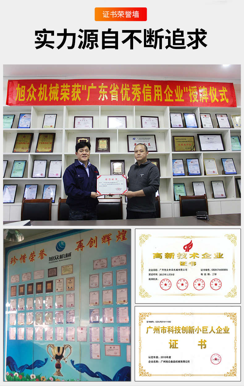 廣州旭眾食品機械有限公司是一家集科研開發(fā),生產(chǎn)設(shè)計,營銷服務(wù)為一體的現(xiàn)代化生產(chǎn)企業(yè)。現(xiàn)代化生產(chǎn)車間,精湛制造技術(shù),所產(chǎn)機械歷經(jīng)市場重重考驗,不斷贏得海內(nèi)外客戶的贊譽。