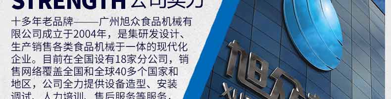 廣州旭眾食品機械有限公司是一家集科研開發,生產設計,營銷服務為一體的現代化生產企業?,F代化生產車間,精湛制造技術,所產機械歷經市場重重考驗,不斷贏得海內外客戶的贊譽。