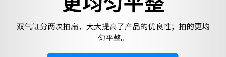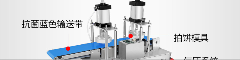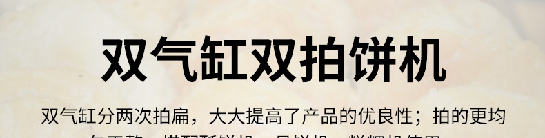 XZ-7200型雙拍餅機,雙氣缸雙拍餅機雙氣缸分兩次拍扁,大大提高了產品的優良性;拍的更均勻平整。搭配酥餅杋、月餅機、糍粑機使用。告別手工、更高效率。讓拍餅機改變生活,降低手工成本,省去繁瑣的手工工序,提高生活品質。