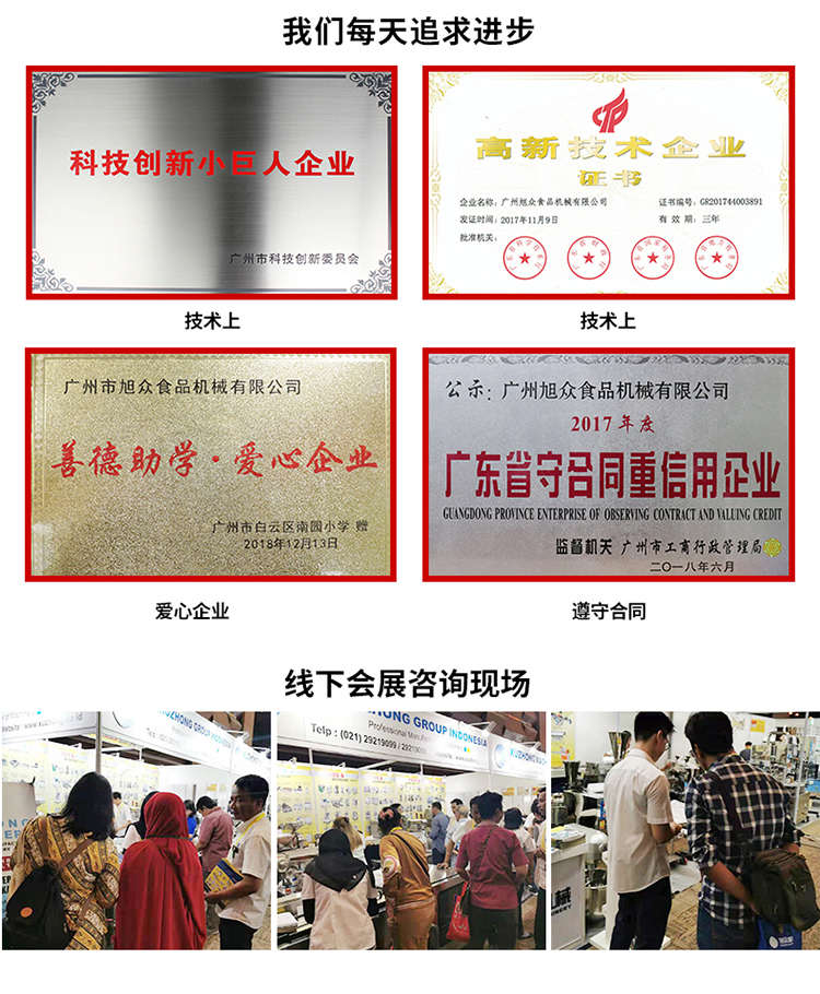 廣州旭眾食品機械有限公司是一家集科研開發(fā),生產(chǎn)設(shè)計,營銷服務(wù)為一體的現(xiàn)代化生產(chǎn)企業(yè)。現(xiàn)代化生產(chǎn)車間,精湛制造技術(shù),所產(chǎn)機械歷經(jīng)市場重重考驗,不斷贏得海內(nèi)外客戶的贊譽。