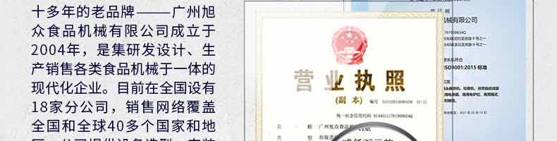 廣州旭眾食品機(jī)械有限公司是一家集科研開發(fā),生產(chǎn)設(shè)計(jì),營(yíng)銷服務(wù)為一體的現(xiàn)代化生產(chǎn)企業(yè)。現(xiàn)代化生產(chǎn)車間,精湛制造技術(shù),所產(chǎn)機(jī)械歷經(jīng)市場(chǎng)重重考驗(yàn),不斷贏得海內(nèi)外客戶的贊譽(yù)。